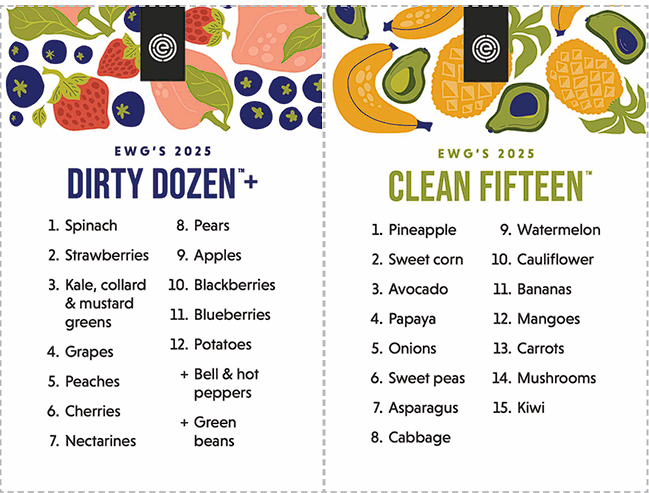 - “Dirty Dozen” – voće i povrće koje sadrži najviše pesticida (npr. jagode, jabuke, grožđe).